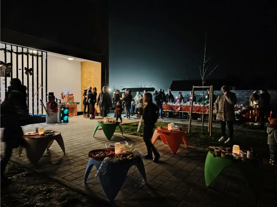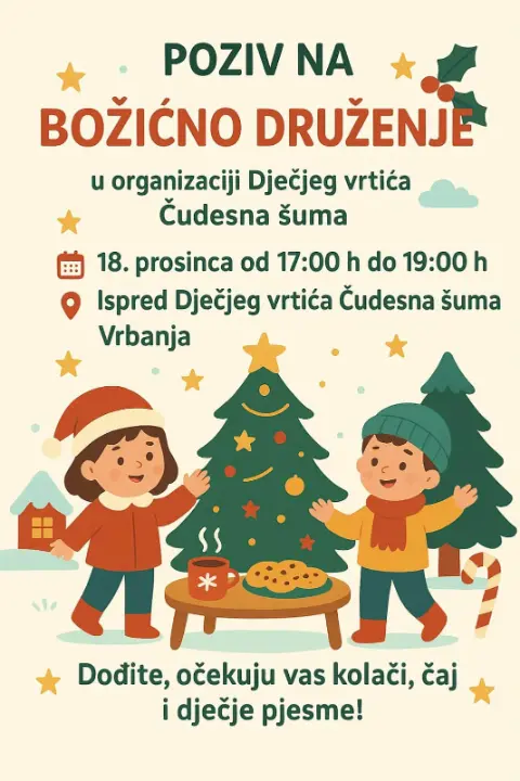 18. prosica održano je prvo božićno druženje djece i roditelja u organizaciji Dječjeg vrtića Čudesna šuma Vrbanja. Odgojiteljice i djeca pripremili su božićne dekoracije, ukrase za božićne jelke i božićne čestitke koje su izložili na štandu ispred vrtića. U suradnji s roditeljima koji su za vrtić ispekli suhe kolačiće, na božićnom druženju, mnogobrojni posjetitelji su se mogli ugrijati toplim čajem koji je pripremila naša kuharica te kušati ukusne kolače. Svi zaposlenici vrtića vrijedno su pripremali dekoracije za vrtić, kutke za fotografiranje i izložbeni štand. Skupine Medvjedići, Ptičice i polaznici predškole za posjetitelje su izveli prigodne recitacije i pjesmice, nakon čega je uslijedilo božićno druženje ispred vrtića uz zvuke božićnih pjesama.