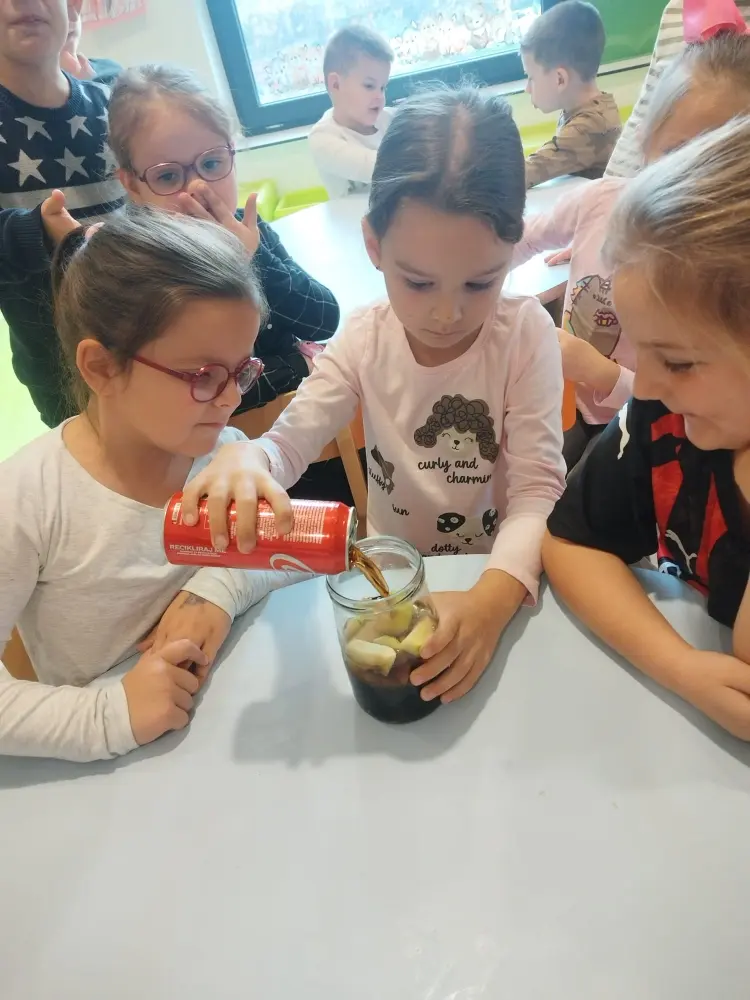 Proveli smo eksperiment u kojem djeca istražuju djelovanje zraka i različitih tekućina na jabuku , djeci je to bio zanimljiv zadatak .