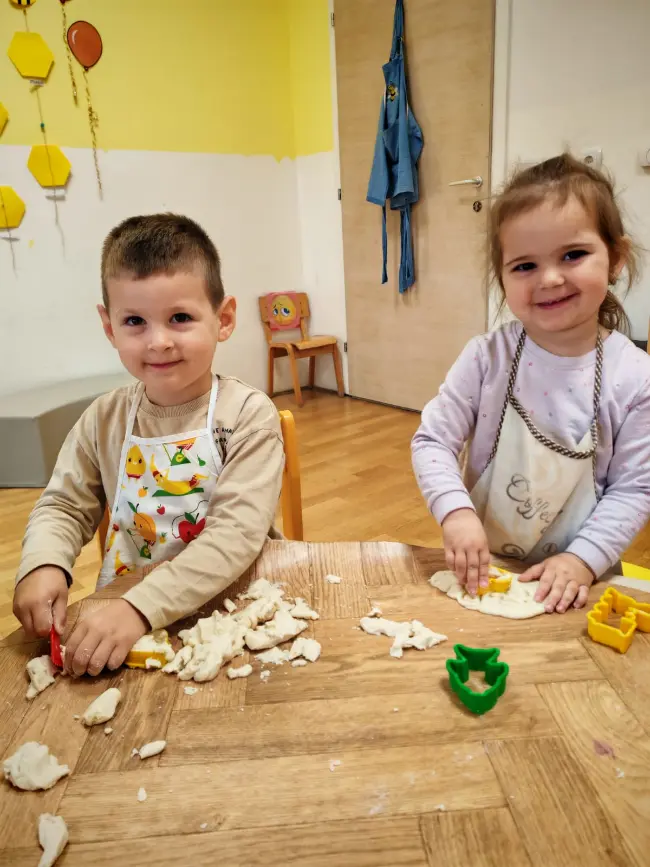 Tijekom obilježavanja Dana kruha i zahvalnosti za plodove zemlje, djeca su sudjelovala uraznim aktivnostima: razgovarali smo o nastanku kruha, vrstama žitarica i važnosti zahvalnostiza hranu. Djeca su mijesila i oblikovala slano tijesto, sudjelovali su u pripremi i pečenjudonata/krafnica. Kroz aktivnosti, djeca su razvijala fine motoričke vještine i učenje oprehrambenim navikama.Slagali su razne puzzle motivima prilagođenim Danima kruha, listali prigodne slikovnice te suuživali u bojankama uz koje su učili razne pojmove. Organizirana je i “izložba” kruha i pecivakoje su donijeli roditelji, uz prigodno uređeni stol s jesenskim plodovima. Na kraju smo svizajedno uživali u blagovanju i druženju, uz molitvu i pjesmu zahvale.