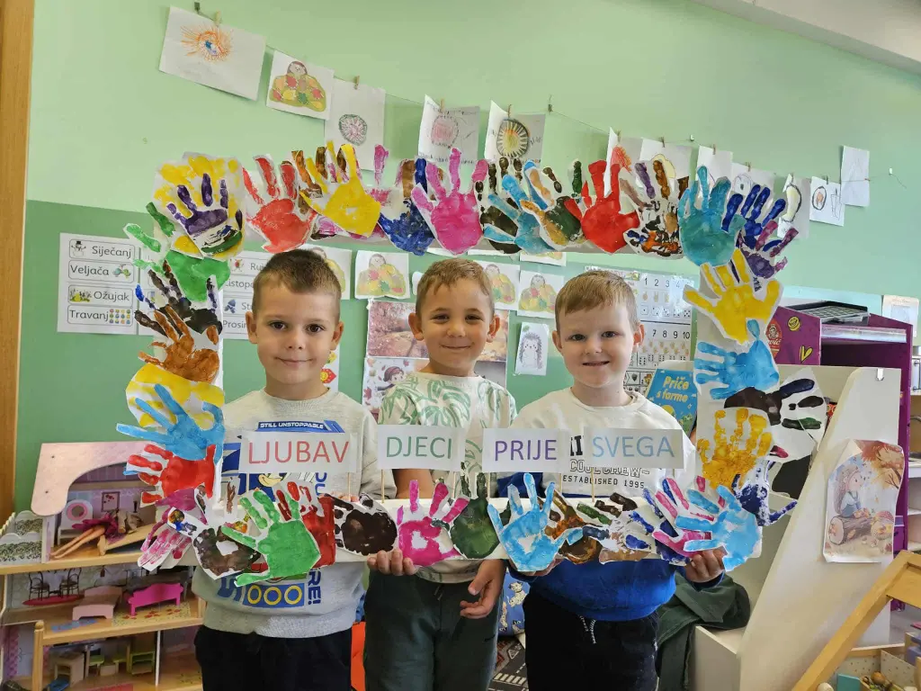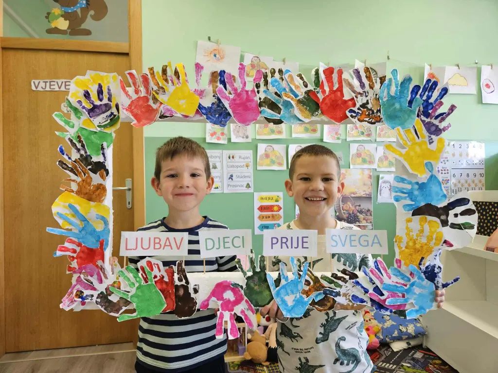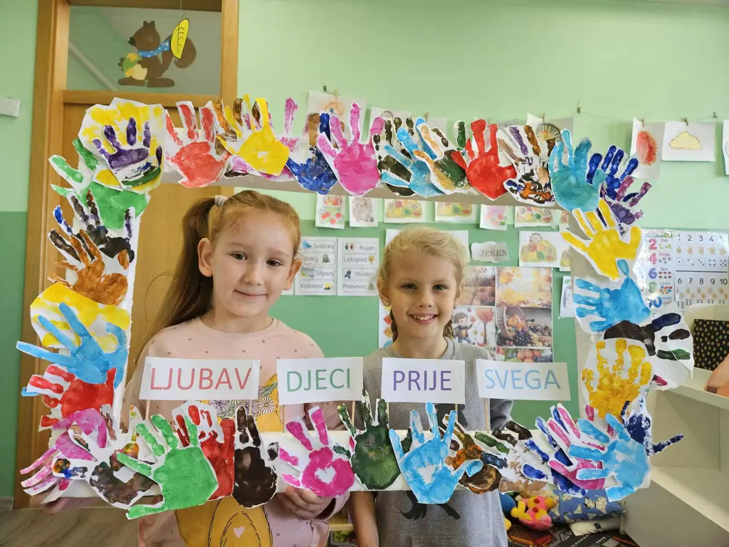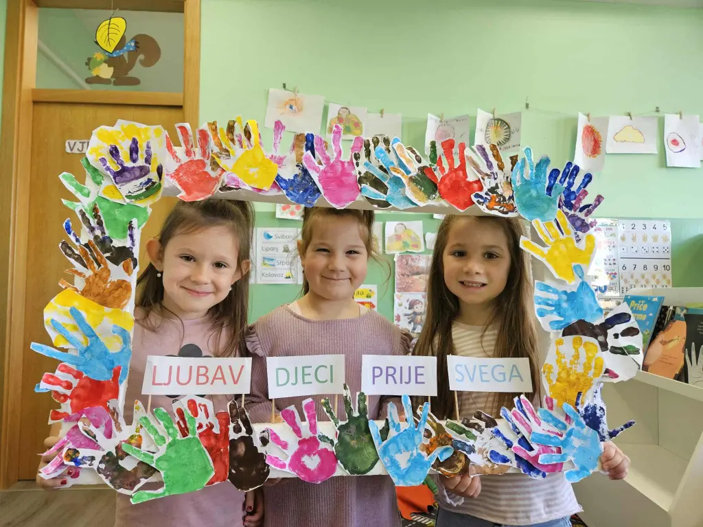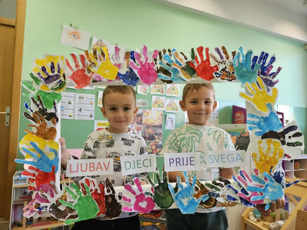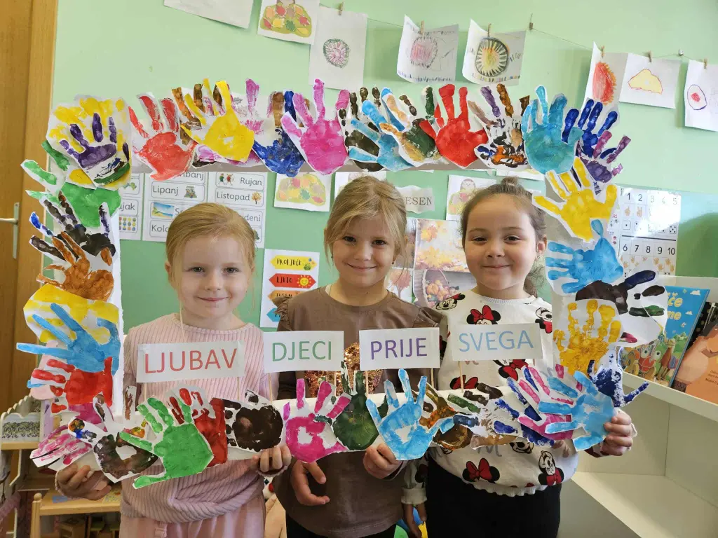 Tijekom Dječjeg tjedna u našoj skupini razgovarali smo o empatiji, prijateljstvu i osjećajima. Djeca su kroz razgovor učila prepoznavati i imenovati vlastite emocije te razumjeti kako se osjećaju njihovi prijatelji. Posjetili smo školsku knjižnicu gdje smo čitali priče o pomaganju i dobroti. Naučili smo pjevati pjesmicu “Kad si tužan ja ću doći”, igrali razne igre koje potiču suradnju i zajedništvo. Također smo izrađivali šareni okvir za fotografiranje, kojima smo obilježili Dječji tjedan i naglasili moto “Ljubav djeci prije svega!”