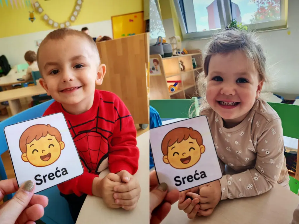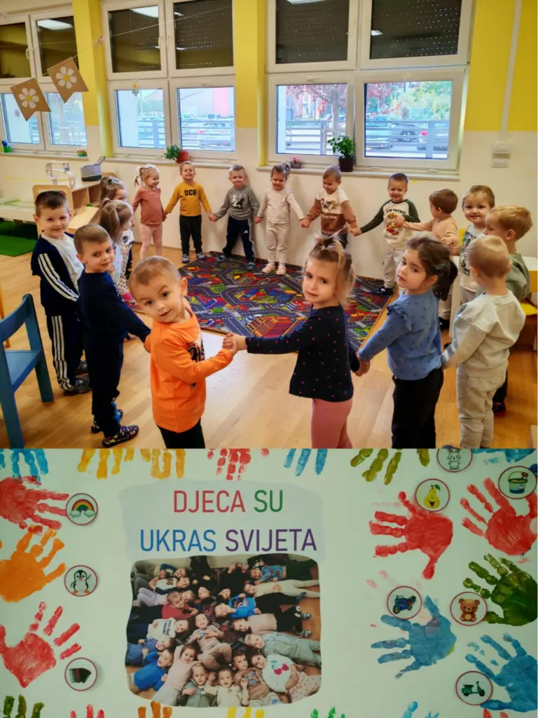 Povodom Dječjeg tjedna, naši su mališani kroz razgovore i igre upoznavali i prepoznavaliemocije – sreću, tugu, ljutnju, ponos, strah… Učili smo kako svaka emocija ima svoje mjesto ikako je važno izražavati osjećaje i poštovati tuđe.Zajedno smo izradili zajednički plakat na temu „Djeca su ukras svijeta“. Na velikom plakatusvoje su otiske dlanova ostavila sva djeca naše skupine, pokazujući da svaka mala ruka čini svijetljepšim i šarenijim.Dječji tjedan obilježili smo i šetnjom, zajedničkim druženjem u dvorištu vrtića te plesom,ispunjeni radošću, smijehom i zajedništvom. Bio je to tjedan pun igara, prijateljstva i veselihtrenutaka, koji nas je podsjetio koliko su djeca doista najveće bogatstvo i ukras našeg svijeta