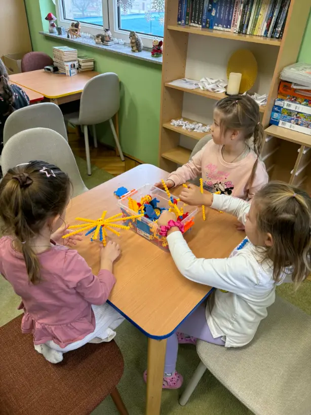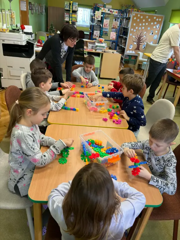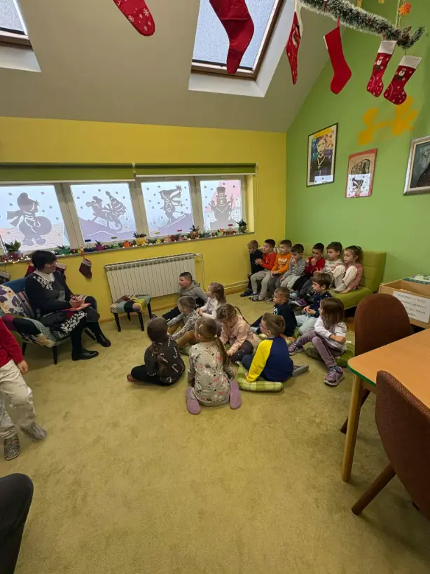 Djeca su bila u posjetu školkoj knjižnici OŠ Vladimira Nazora u Komletincima gdje su s velikim zanimanjem slušala priču o Snjegoviću i Božiću koju im je pročitala knjižničarka Katica Novoselac. U ugodnom i toplom okruženju knjižnice uživali su u čarobnoj božićnoj priči, pažljivo prateći svaki detalj. Nakon priče, djeca su se igrala slagalicama i drugim drušvenim igrama. Posjet je protekao u veselom raspoloženju i probudio kod djece ljubav prema knjigama i slušanju priča.
