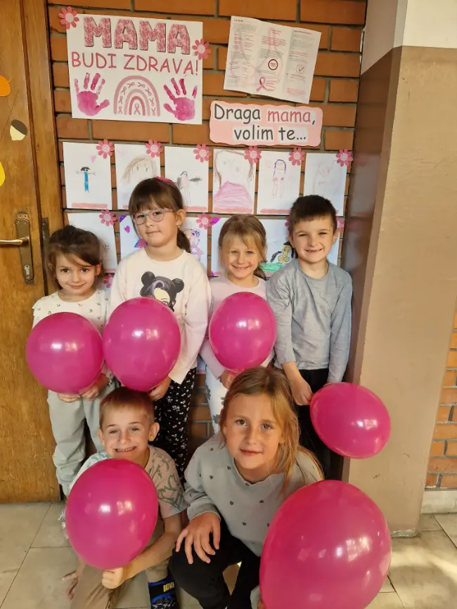 Djeca su izrađivala ružičaste vrpce, puhala ružičaste balone, crtala svoju mamu, ukrašavala zajednički plakat i s ponosom pozirala za ružičastu fotografiju podrške.“ Zdrava mama – sretna obitelj!”