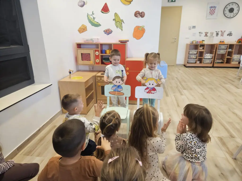 Zabavljali smo se i u igri „Tko će prije pojesti?“ — djeca su namotavala žutu vunu koja je predstavljala špagete na rolu. Igra im se jako svidjela, a sobom se širila vesela atmosfera i glasno navijanje za prijatelje.